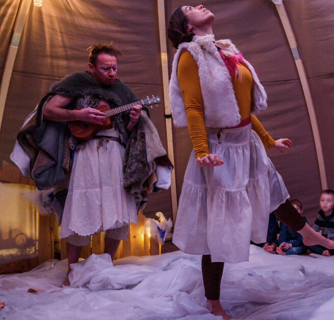 Installez-vous sous une tente, en cercle. Imaginez-vous sous une coupole d’étoiles, les mains déposées sur un tapis de feuilles et de brindilles, regardant ensemble le « foyer ». Une conteuse est là, elle nous parle du tout début du monde. Lorsque LE TOUT vivait en harmonie. Lorsque les plantes, les animaux, les femmes et les hommes parlaient encore la même langue. Petit à petit, les hommes et les femmes sont devenu.es « les têtes au carré ». Et dans le monde des « têtes au carré », il n’y avait plus de place pour les plantes et les animaux.