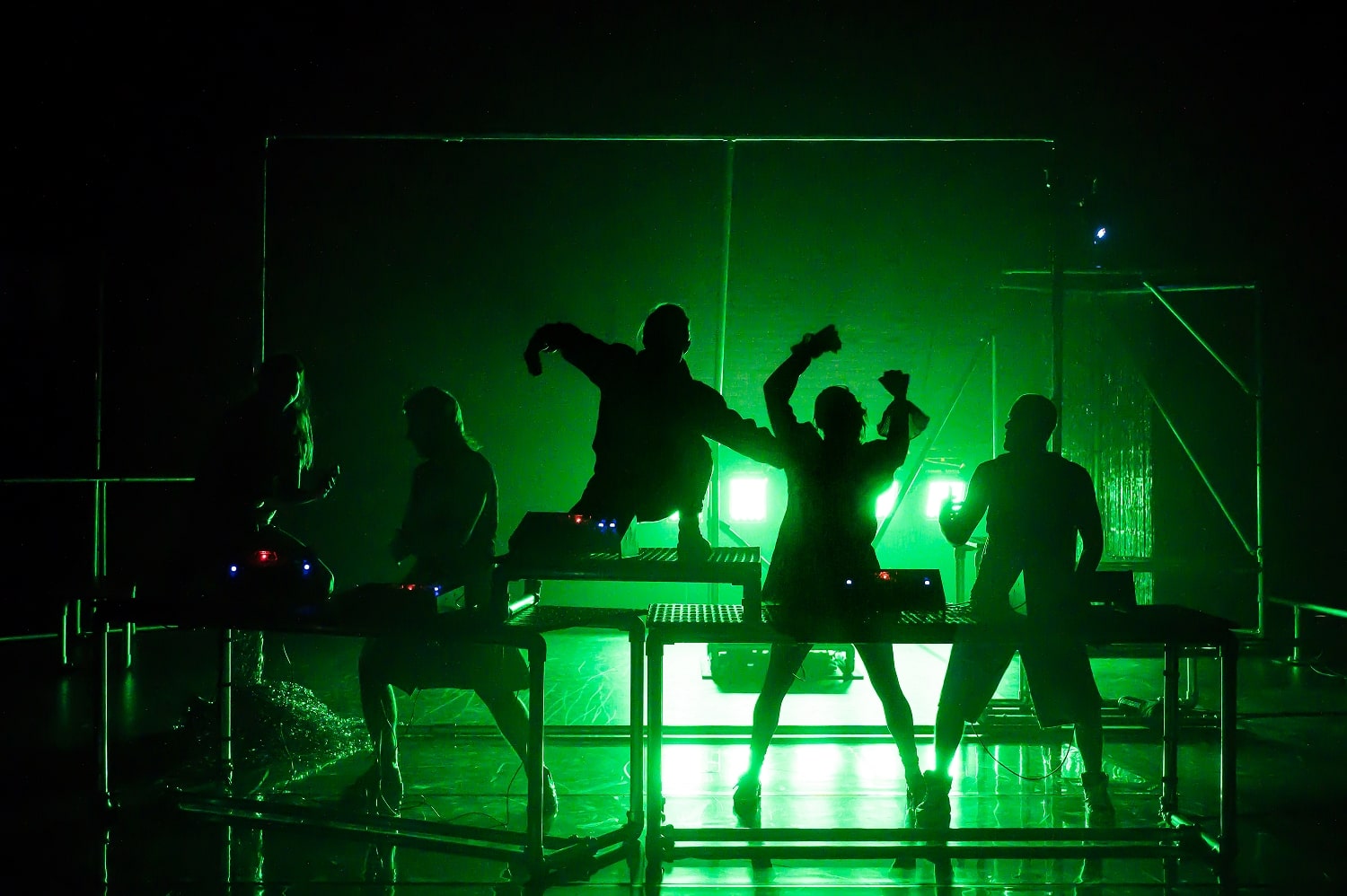 Cinq interprètes électrisants se mouvent entre leurs platines DJ excentriques et la scène pour nous livrer un show vibrant et euphorisant. Avec cette pièce chorégraphique qui met ces figures de la nuit et de la fête à l’honneur, on contemple les gestuelles, on vibre, on pulse et on se laisser happer par une virée festive qui n’en finit plus. S’emparant du plateau comme d’un terrain de jeu, ce crew partage autant leurs sons rock électro que leur énergie contaminante nous invitant à la vivre ensemble, même assis dans un fauteuil de théâtre.